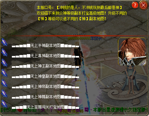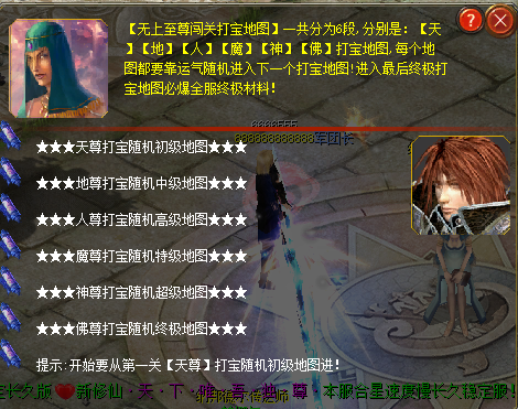 传送回雷鸣大陆,第五关:神尊打宝随机高级地图打死BOSS几率掉高级物品,运气好可以随机被传送到第六关佛尊打宝随机终极地图,